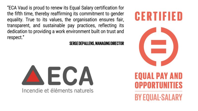 Vevey / Lausanne, 28 October 2025 – The EQUAL-SALARY Foundation is pleased to announce that Établissement d’assurance contre l’incendie et les éléments naturels du Canton de Vaud – ECA has obtained the Equal Pay and Opportunities certification, by EQUAL-SALARY, a symbol of excellence in terms of equality for employees of ECA in Switzerland. After successfully passing the statistical analysis of its salaries, ECA. underwent an internal audit entrusted to SGS, proving that it practices equal pay and equal opportunities for women and men.