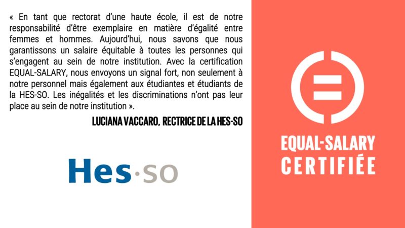 « L’éducation est un des grands égalisateurs en matière d’égalité des chances. Avec la certification EQUAL-SALARY, le Rectorat de la HES-SO accroît sa responsabilité sociétale en prouvant son engagement en faveur de l’égalité salariale entre les femmes et les hommes. Cette certification envoie un message clair de justice, de diversité et d’inclusion aux étudiants et étudiantes ainsi qu’aux universités suisses. Nous sommes fières qu’une institution de formation comme la HES-SO soit certifiée ! » commente Lisa Rubli, co-CEO de la Fondation EQUAL-SALARY.