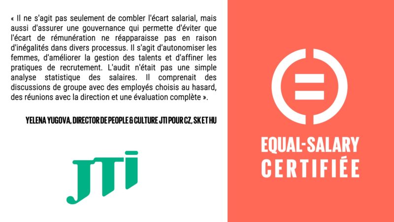 Vevey/Prague, le 14 mars 2024 – La Fondation EQUAL-SALARY est heureuse d’annoncer que Japan Tobacco International a obtenu la certification EQUAL-SALARY couvrant tou.te.s ses employé.e.s en République Tchèque, Slovaquie et Hongrie. La certification EQUAL-SALARY est synonyme d’excellence en matière d’égalité salariale et d’égalité des chances, combinant une analyse statistique de l’ensemble des salaires et un audit interne confié à PwC. Avec notre certification, JT International République Tchèque, Slovaquie et Hongrie prouvent qu’elles appliquent l’égalité salariale et l’égalité des chances pour les femmes et les hommes.