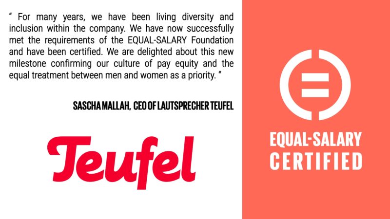 “For many years, we have been living diversity and inclusion within the company. We have now successfully met the requirements of the EQUAL-SALARY Foundation and have been certified. We are delighted about this new milestone confirming our culture of pay equity and the equal treatment between men and women as a priority”, added Sascha Mallah, CEO of Lautsprecher Teufel.